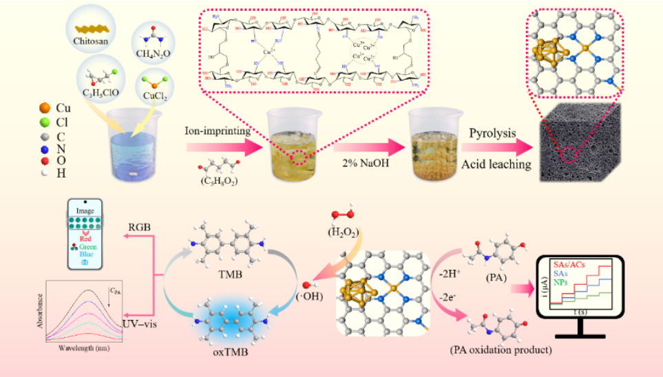近日,我院2023级材料与化工专业硕士研究生廖辉阳以第一作者在国际知名期刊《Biosensors and Bioelectronics》上发表题为《Ion-imprinting strategy towards a novel two-in-one copper-based nanozyme for sensitive electrochemical-colorimetric dual-mode detection of paracetamol》的研究论文;我院李俊华教授为第一通讯作者,衡阳师范学院为第一署名单位。该研究设计并合成了一种锚定于氮掺杂壳聚糖衍生碳载体上的铜单原子/原子簇结构(CuSAs/ACs@NC),成功构建出一类具有优异电催化与类酶催化活性的新型纳米酶材料。