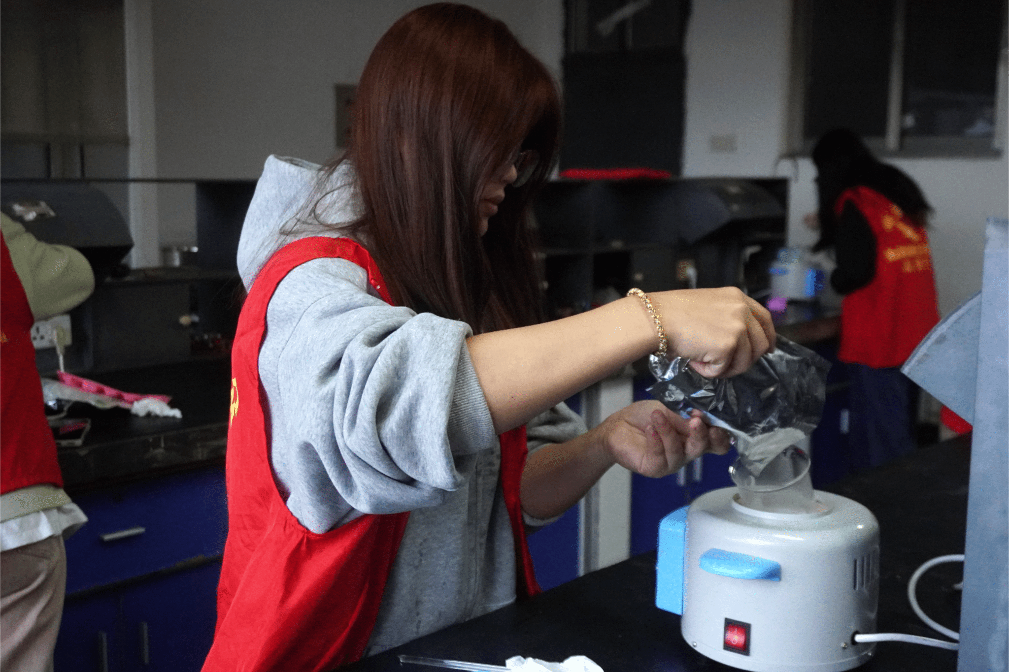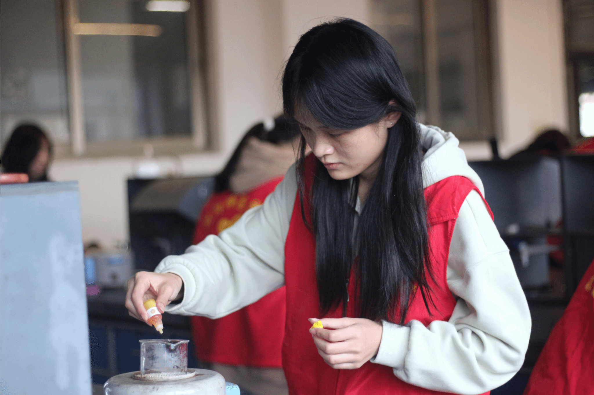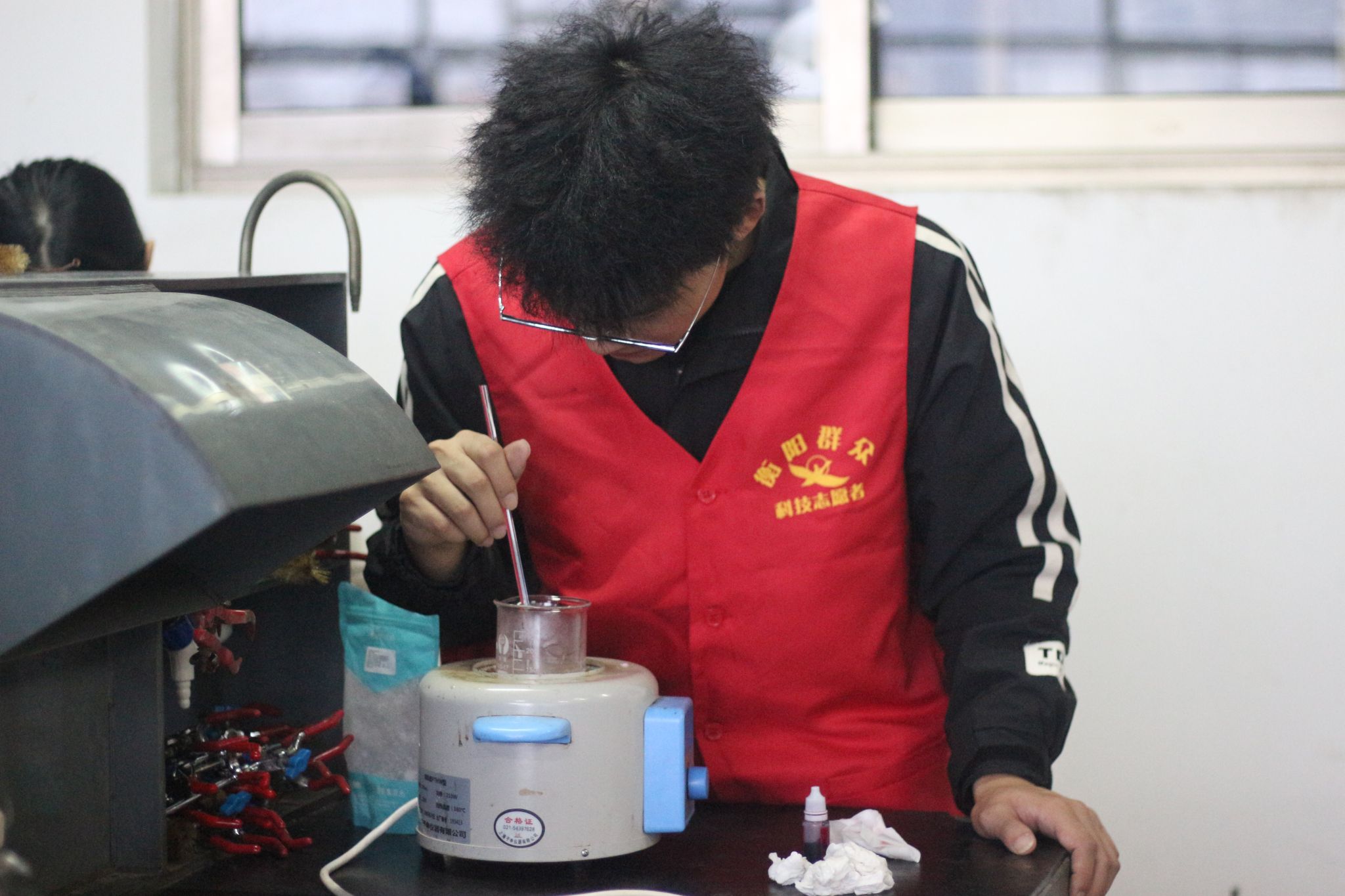 (志愿者们正专心致志地调配原料、搅拌皂液)