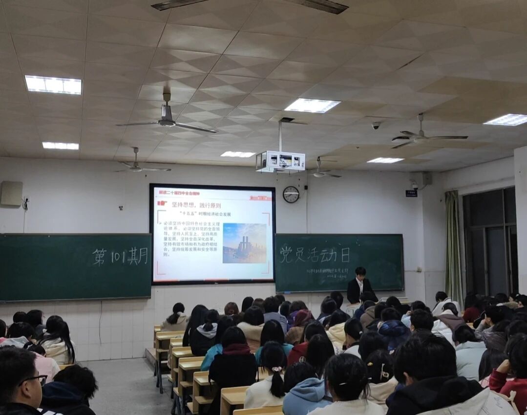 11月30日晚,化学与材料科学学院学生党支部第一百零一期“党员学习日”活动于行知楼601开展,2307班刘澎同学以《锚定高质量发展的航向,擘画“十五五”奋进蓝图—学习贯彻党的第二十届四中全会精神》为题与全体学生党员和学习积极分子分享了他的学习心得。
